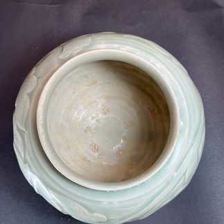 器呈扁圓腹狀,圈足略短而漸收,口沿微微外撇。通體刻畫纏枝花卉紋飾,或為牡丹,枝葉蜿蜒纏繞,葉脈細緻刻劃。整器施淺淡青綠釉色,釉汁於紋飾深處匯聚,呈現出較深的橄欖色調。直徑14公分(5 1/2英寸)