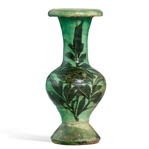 This magnificent vase belongs to a small group of Cizhou wares decorated with a black floral design under a green glaze. Vessels of this type appear to have been a specialty of the celebrated Guantai kilns, Cixian, Hebei province, around the late Northern Song (960-1127) and early Jin (1115-1234) dynasties. Coloured with copper pigments, this rare glazing represents one of the earliest examples of low-fired enameling on high-fired stoneware and was one of very few bright colours available at the time of production. Very similar fragmentary vases of this type have been recovered directly from the Guantai kiln site, see Guantai Cizhou yaozhi / The Cizhou Kiln Site at Guantai, Beijing, 1997, pl. 70:1; and Haku to koku no kyōen/Charm of Black and White Ware: Transition of Cizhou Type Wares, Osaka Municipal Museum of Art, Osaka, 2002, cat. nos 11-1 and 11-2; as well as similar examples of this design found in the more conventional white-ground colouration without the addition of low-fired green. Compare fragments of the latter type in op. cit., Beijing, 1997, col. pl. 9:2; pl. 13:3 (centre); pl. 23:1 and 2; and p. 123, fig. 52:1 and 4; and op. cit., Osaka, 2002, cat. nos 71- and 71-2.