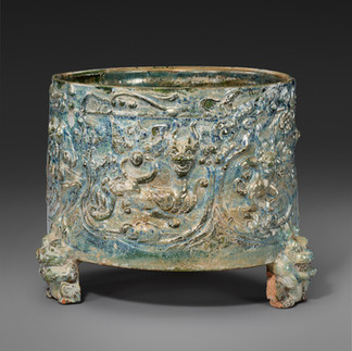 It is very rare to find a Han-dynasty censer of this type with such elaborate decoration of mythical beasts and immortals, and of such large size, with most examples measuring between 6-7 ins. in diameter. Such Han-dynasty pottery versions were based on contemporary bronze prototypes, such as one in the Freer Gallery of Art, Washington, DC, illustrated by M. Wang in A Bronze Menagerie: Mat Weights of Early China, Boston, 2006, p. 70, fig. 10.