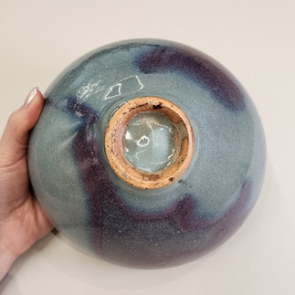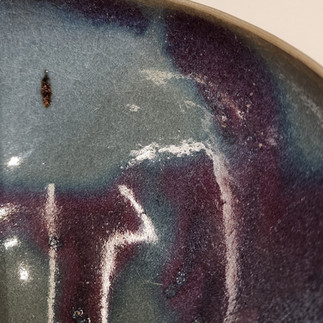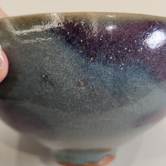 北宋至金鈞窯「天藍釉紫斑」盌之可貴,不止在「紫斑」本身的稀少,更在於鈞釉於高溫還原與二次施彩(含銅呈色)所形成之不可預測性:同樣是天藍底色與紫斑,成器效果往往在釉層厚薄、玻化程度、流釉收釉的節奏以及紫斑入釉的融散邊界上呈現顯著差異。本品口沿見約 6 公分之沖(或由片紋延伸),在「大盌」尺度下仍能保存整體釉光與乳濁感,並以較鮮明之紅紫斑形成有效視覺支點;其學術與審美評價,宜在同類作品的尺寸譜系與「紫斑—天藍」對比關係中,連同品相因素一併衡量。
