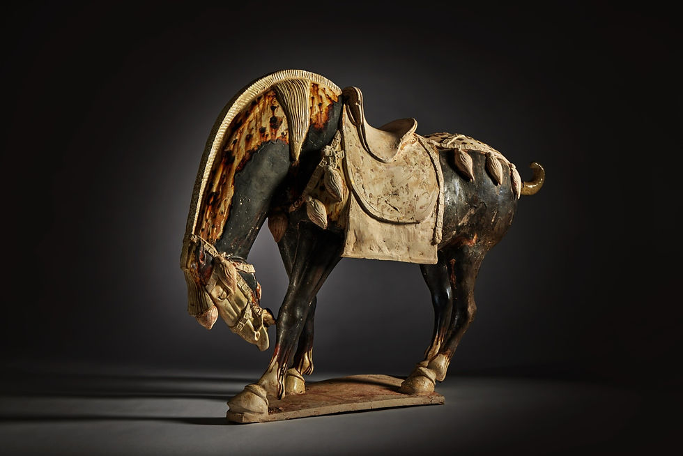Skillfully molded with stocky legs, broad torsos, graceful necks, and often intricate trappings, Tang horses are among the most ubiquitous and celebrated forms of Chinese sculpture ever produced. These powerful beasts, assembled from complex molded sections, originally formed part of larger collections of ‘spirit objects’ (mingqi) in elite funerary contexts and reached their zenith around the eighth century, at the height of the Tang dynasty (618–907). Through their mingqi, Tang elite sought to recreate real-world possessions in clay and other enduring materials, and bring their wealth and status with them into the next world. However, while other sculptural forms, including Buddhist guardians, attendants and camels, are also frequently attested in Tang burial contexts, no other subject has had the lasting and profound impact of the Tang horse.