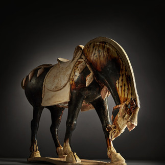 While many Tang horses display a level of sophistication in their sculpting, it is exceedingly rare to find such a degree of naturalism on a figure of this type. Unlike more commonly attested figures glazed predominantly in white, amber, or almost supernaturally in the greens and blues of the sancai (‘three color’) palette, the present horse features a striking yet simple piebald coat. With a second iron-rich layer of glaze draped over the more standard amber, still visible around the ankles and neck, the horse is robed in a remarkably opaque, almost iridescent, black coat rarely so successfully achieved at scale. Combined with the selective application of amber splashes around the neck, the figure appears as if alive, its mottled fur flowing in the breeze.