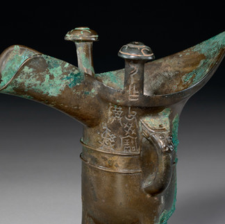 Of particular interest is the inscription cast on the upright post and extending onto the upper body of the vessel adjacent to the handle reading Yi zuo fu gui bao zun yi, which may be translated as :'Yi made this precious vessel for Father Gui.' The inscription follows a standard Western Zhou dedicatory formula in which zuo (made) introduces the act of commissioning, the dedicatee is specified as 'Father Gui,' and the vessel is described in honorific terms as a treasured ritual implement.