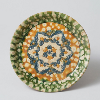 在紋飾佈局上,多數唐三彩盤採用中心飾以大型花卉紋、周緣輔以臘纈(蠟染工藝)感白斑的構圖,本作亦承襲此典型範式。盤心以嚴謹的刻線表現出對稱的“寶相華紋”(寶相花),利用胎體原色與褐釉、藍釉交相輝映。從寶相花外緣至口沿的過渡區施以褐釉,而近口沿處則轉為綠釉,色彩分區明確,展現了卓越的色彩平衡感。此外,環繞中心花紋並向外放射分布的無數白斑直達盤沿,營造出繁花似錦的氣氛。這些白斑如水泡般大小不一,筆觸靈動自然,與盤心規整嚴密的幾何刻線形成了動靜結合的藝術趣味。