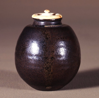 茄子茶入は、丸形のやや下膨れで、口が細くすぼまった形がナスに似ていることから付いた名称です。全体に艶のない黒釉がかけられていますが、胴の一部には茶褐色などがみられ、微妙な色合いの変化も楽しめます。銘の「七夕」の由来は不明ですが、小堀権十郎政尹(1625~94 号は篷雪)の命銘であるといわれています。