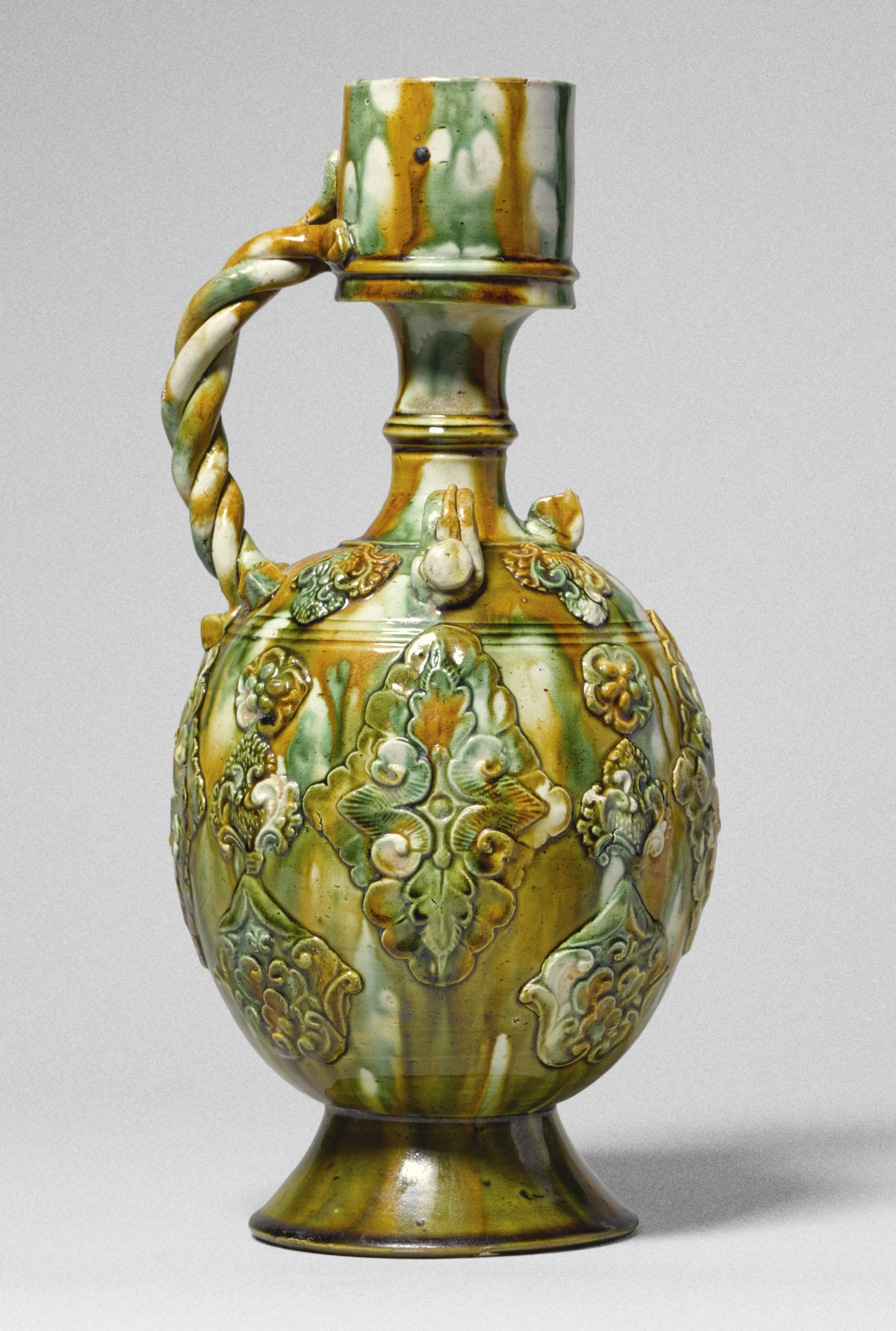 The first half of the Tang dynasty saw an unprecedented rise in the ingenuity and skills of the country’s artisans who strove to meet the rising demands of an affluent and discerning aristocracy. In no other period of China’s long history did its potters understand so successfully to create luxury items out of mere clay, as this striking ewer exemplifies. Superbly designed and exactingly executed, it is an object with a dramatic impact. Its crisp profile is composed of a daring combination of cylindrical, convex and concave outlines. Its sprig-moulded floral and foliate appliques, freely modelled rope-twist handle and well applied, splashed sancai glazes, document the potters’ intention to create a masterpiece, embellished as lavishly as possible.