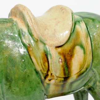 三彩(sancai)為唐代低溫鉛釉陶代表,以鐵(琥珀/褐)、銅(綠)、偶爾鈷(藍)在白化妝土上潑灑,色彩流動自然。此件綠釉主調、琥珀褐潑鞍部與身,白色鞍墊點綴,展現早期三彩大膽美學。產地多河南鞏義或陝西西安周邊,7–8世紀初高峰,受中亞影響,動物造型寫實。