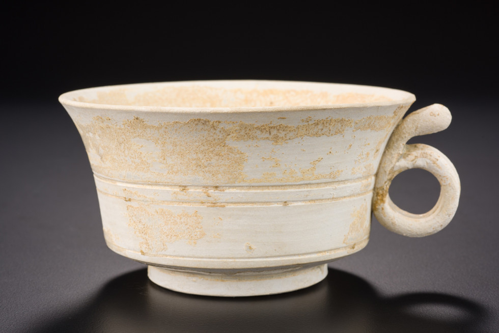 陶、瓷质吸杯,应为仿金银器造型制作,除黑石号出水一批白釉绿彩及绿釉器之外,其他所见零散。国内,扬州唐城遗址可见几例,如扬州教育学院及扬州三元路工地各出土一件绿釉陶吸杯残件。海外地区,伊拉克萨马拉遗址出土有白釉绿彩吸杯残片,釉面光亮,与黑石号出水品类似。法国集美博物馆收藏有同款绿釉陶吸杯,中间贴塑小鸭。