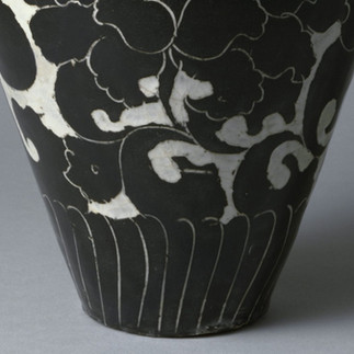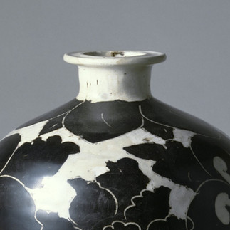 白化粧という、白土や白泥などを素地の表面に薄く掛けた上に、鉄絵具を塗り、牡丹唐草文(上向きと下向きの二輪の大きな牡丹の花を茎や葉の唐草文で繋ぐ)を線彫りし、文様の地の鉄絵具を鋭い刃物で掻き落とす。宋時代の民窯を代表する磁州窯で焼成された。磁州窯は、河北省部鄲市郊外の一帯に分布する窯場。口が小さく、肩が張り、腰の部分がすぼまった形の瓶を「梅瓶」という。朱時代から各地の窯で焼かれはじめた。通常、被せ蓋が付くが、本品には添っていない。