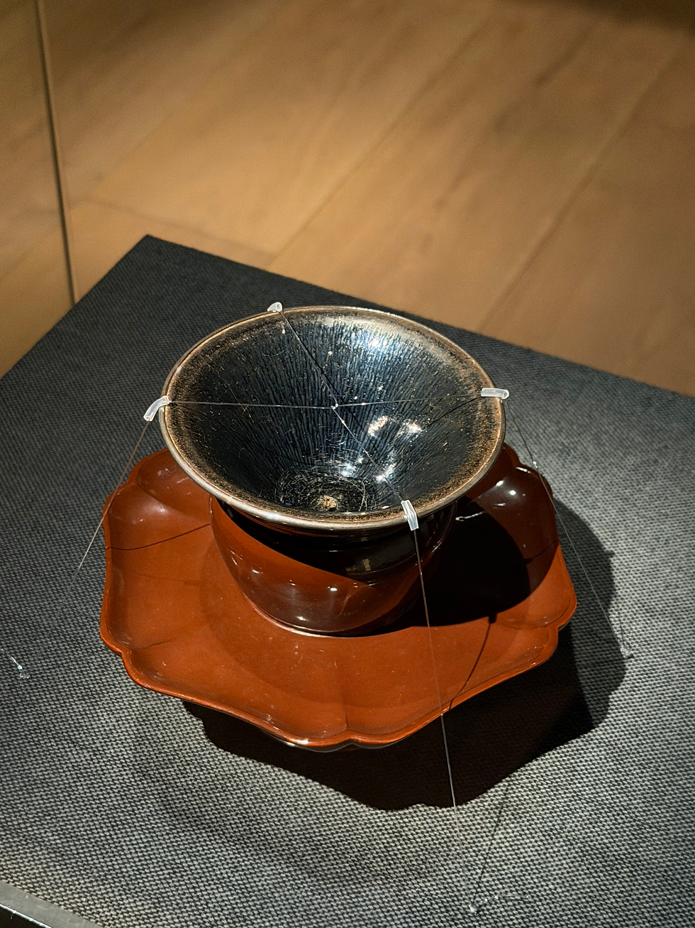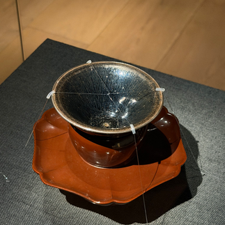 本器に付属する天目台は宋代のオリジナルではなく(おそらく明代頃の作)、しかし大台に小碗を組み合わせる形式は非常に貴重な資料です。このような組み合わせは宋画にも登場しており、展示解説でも関連図像を引用して紹介されています。