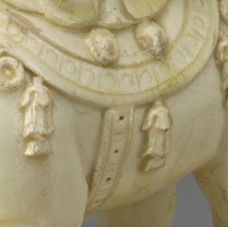 It is a work of few analogues. The body is made in the shape of an elephant with six cylindrical candlesticks on the back. The base is rectangular and is surrounded by lotus petals. The elephant's body is fitted with various ornaments and its back is covered with a round carpet rug. White porcelain production began in earnest in the late 6th century at the Sclayi kilns in Henan province and the Xing kilns in Hebei province, but was not completed until the late 8th century. Based on the style and shape of the lotus petals and the white porcelain glaze pool, this piece is thought to date from the early Tang dynasty, the late 7th century. The elephant figure, pedestal and lotus petals around the candlestick stand give the work a strong Buddhist feel.