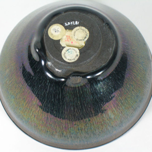 The walls of this large yankou wan, or funnel-shaped, tea bowl expand from the small, circular foot, beginning their steep ascent to the lightly indented, vertical lip at an angle approximately one-half inch above the foot. Thin at the rim, the walls thicken as they descend, so the relatively heavy bowl has a low-set center of gravity. Of standard Jian type, the short footring has a flat blottom and straight walls of intermediate thickness; also of standard type, the base is both flat and shallow. Appearing black, a dark brown glaze coats the bowl inside and out, excluding the foot and base. Although the angled change of profile arrested its flow on one side, the glaze ran to the foot in two thick tears on the other; the thick welt at the glaze's lower edge is thus irregulary configured. Denser at the mouth, a pattern of silvery brown hare's-fur markings extends to the glaze edge on the exterior and to the small, circular, lightly tilted floor on the interior. The exposed body clay on the bowl's lower eterior assumed a dark purplish brown skin in firing. The bowl was turned on the potter's wheel, after which its foot and base were shaped with a knife. Following a period of drying, the bowl was dipped in the glaze slurry; once it had dried again, its lip was immersed in an iron-bearing slip, which caused the hare's-fur streaks to form in the kiln. The bowl was fired right side up in its saggar, seated on a clay firing cushion.Object Number: 2007.81